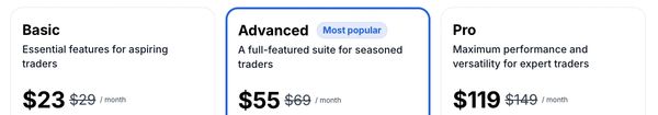 Starter: $50/month until $50,000 trading funds, then upgrades to Pro ($100/month).